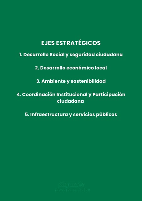 EJES ESTRATÉGICOS 1. Desarrollo Social y seguridad ciudadana 2. Desarrollo económico local 3. Ambiente y sostenibilidad 4. Coordinación Institucional y Participación ciudadana 5. Infraestructura y servicios públicos